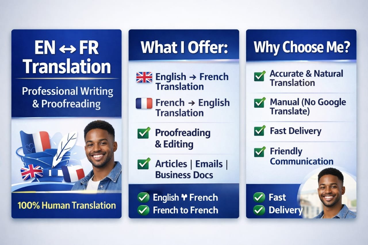 I provide accurate, natural, and human translation between English and French, ensuring your message is clear and professional.